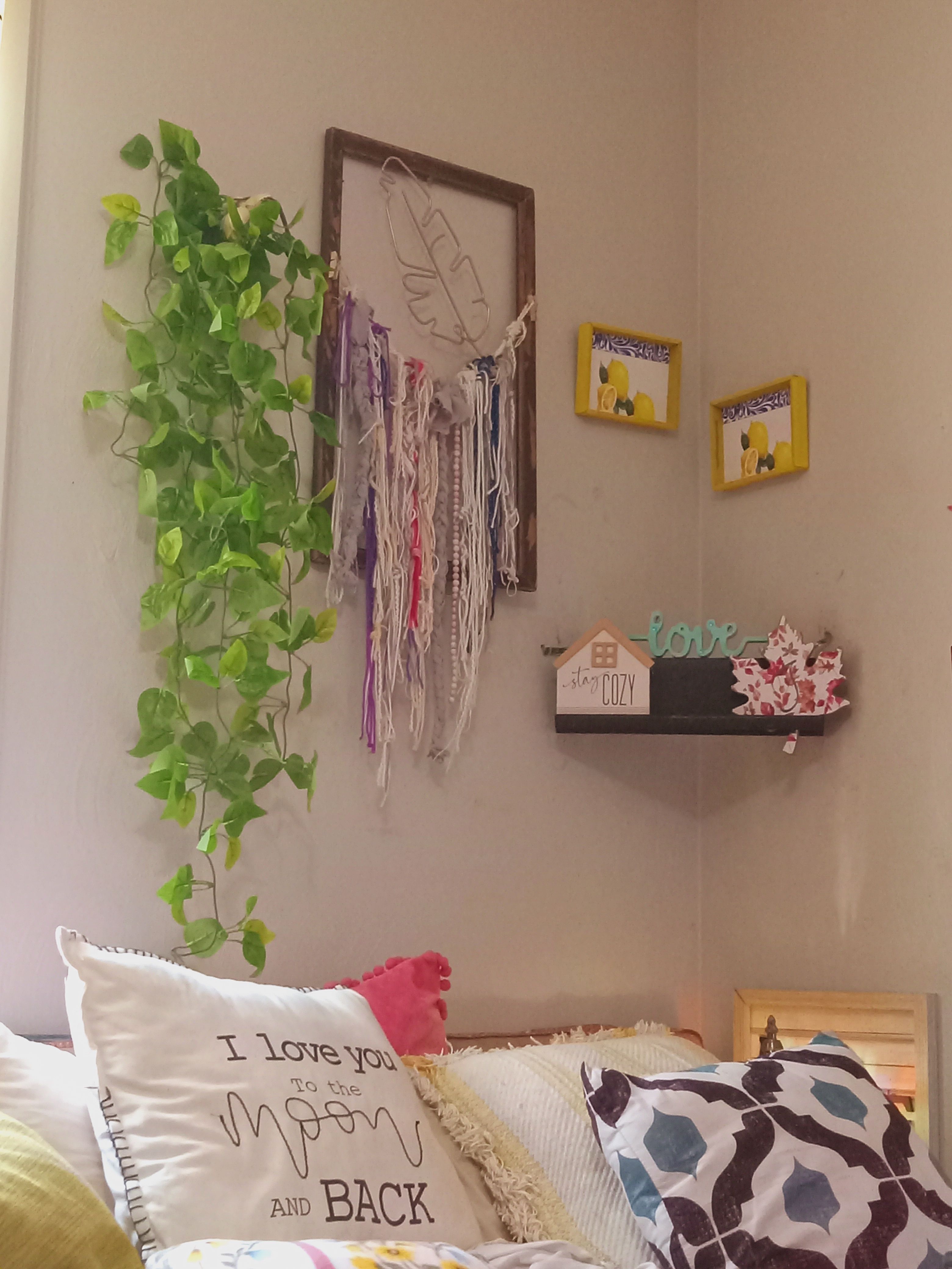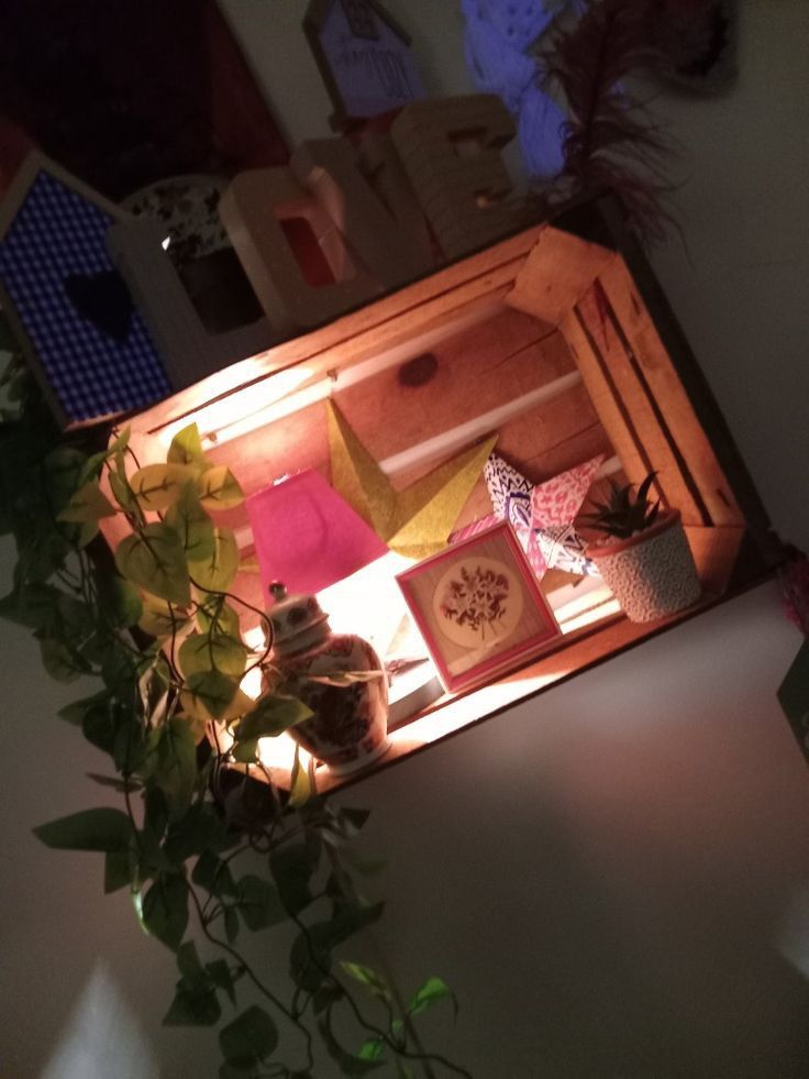 Crafty creations by-jessi Handmade vintage luggage deco patch work I have been using crate art for my walls Garland Dream catcher's and handpainted and plant stand junk Journal Aarow mini books and more